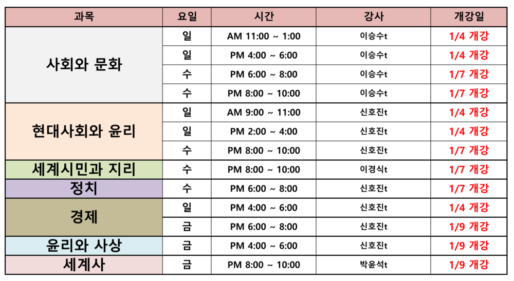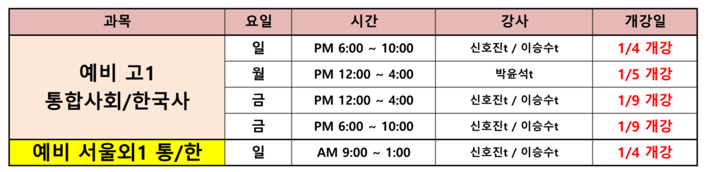 ★ 예비 고1 겨울방학 시간표 ★ 통합사회/한국사 (ver.11/23)