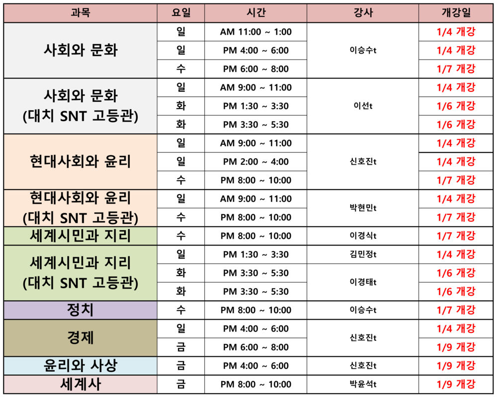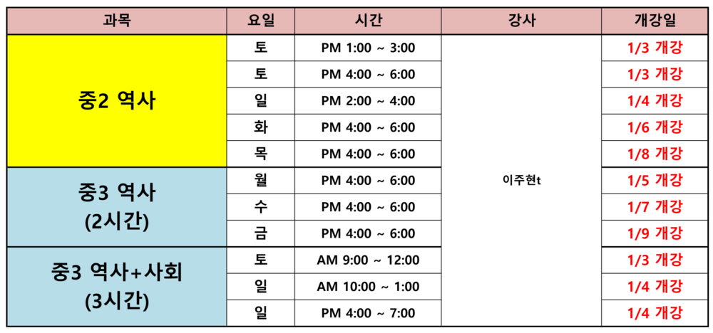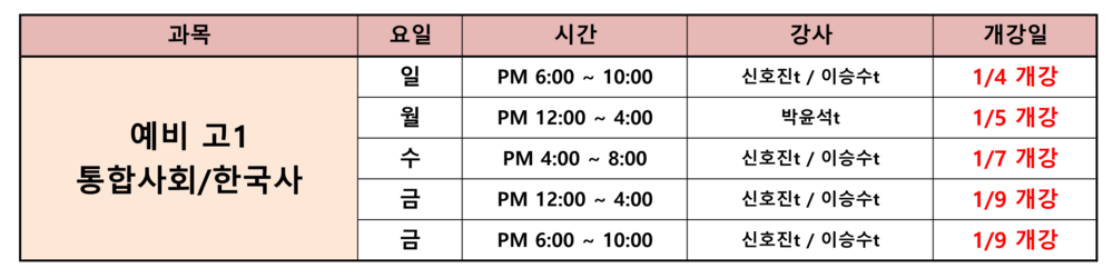 ★ 예비 고1 겨울방학 시간표 ★ 통합사회/한국사 (ver.12/16)