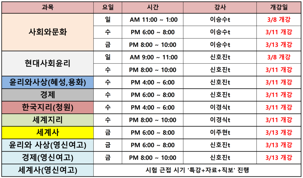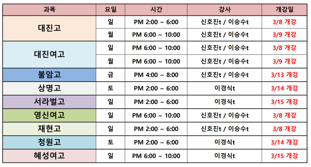 ※ 예비 시간표가 있습니다. 오픈반 시간이 맞지 않는 경우에는 학원으로 전화 상담 부탁드립니다.